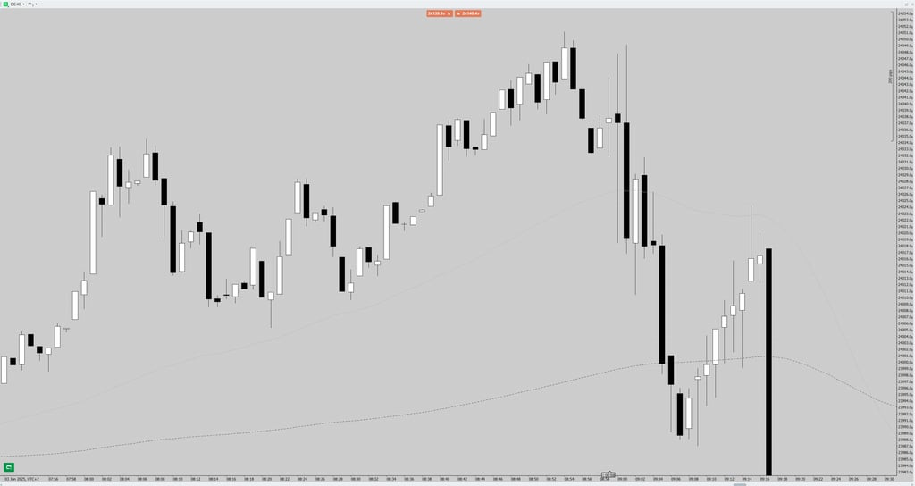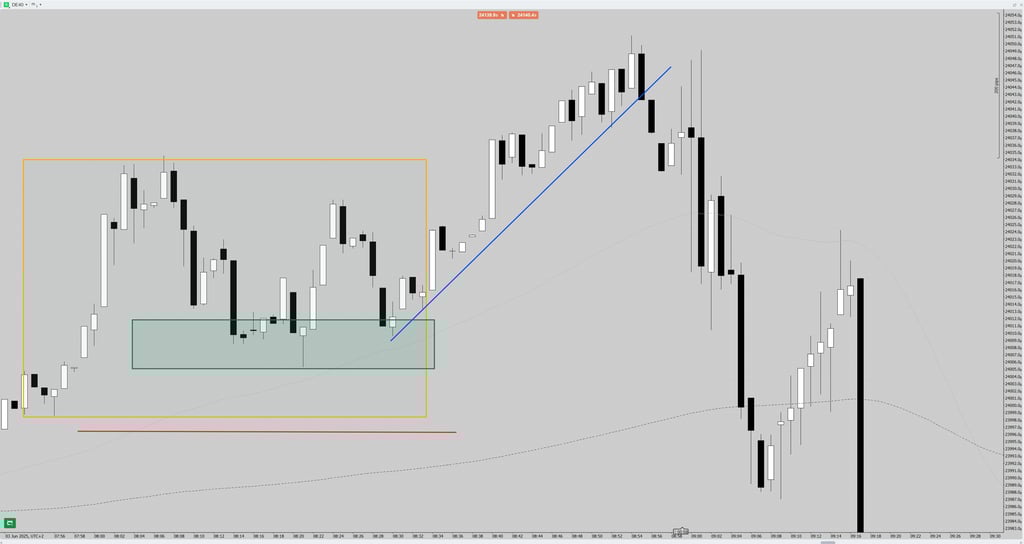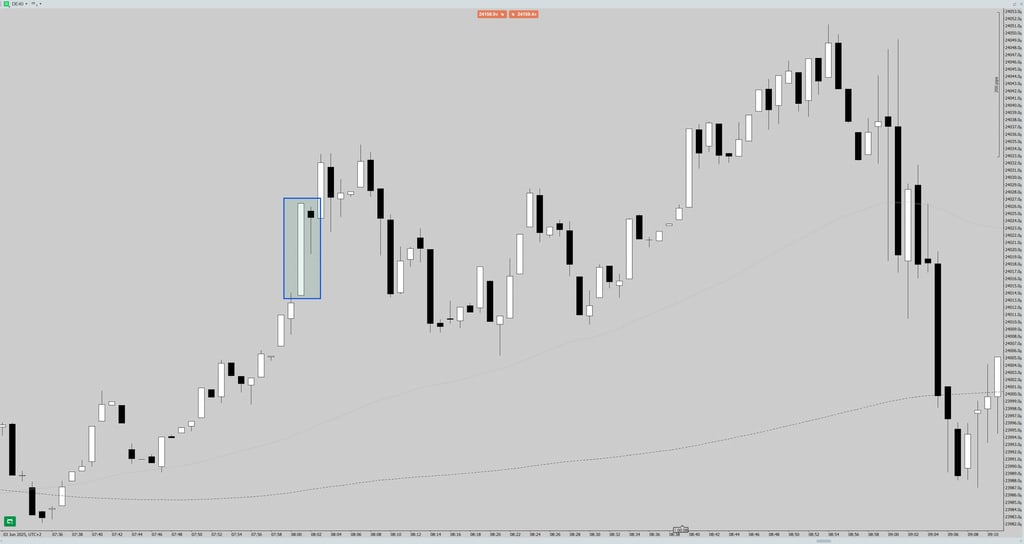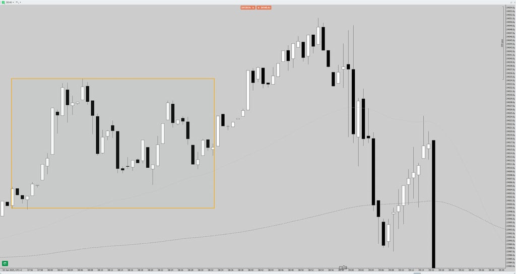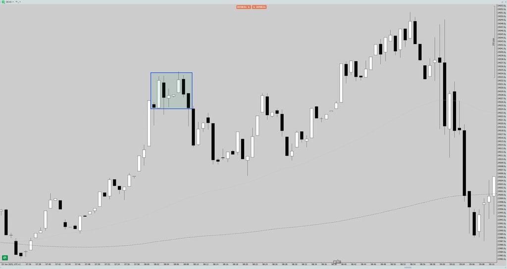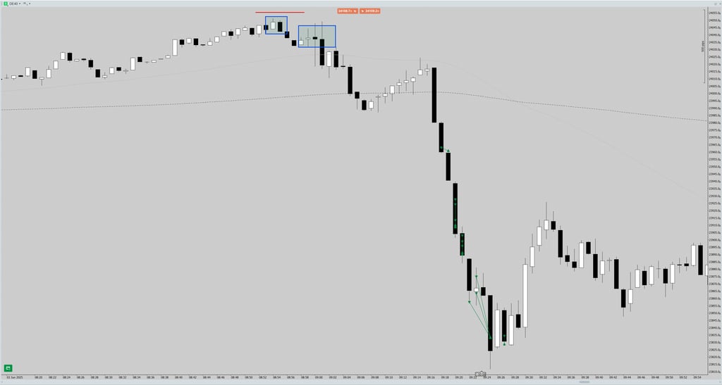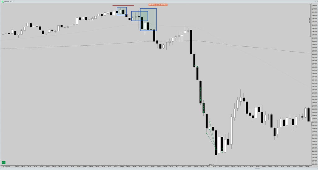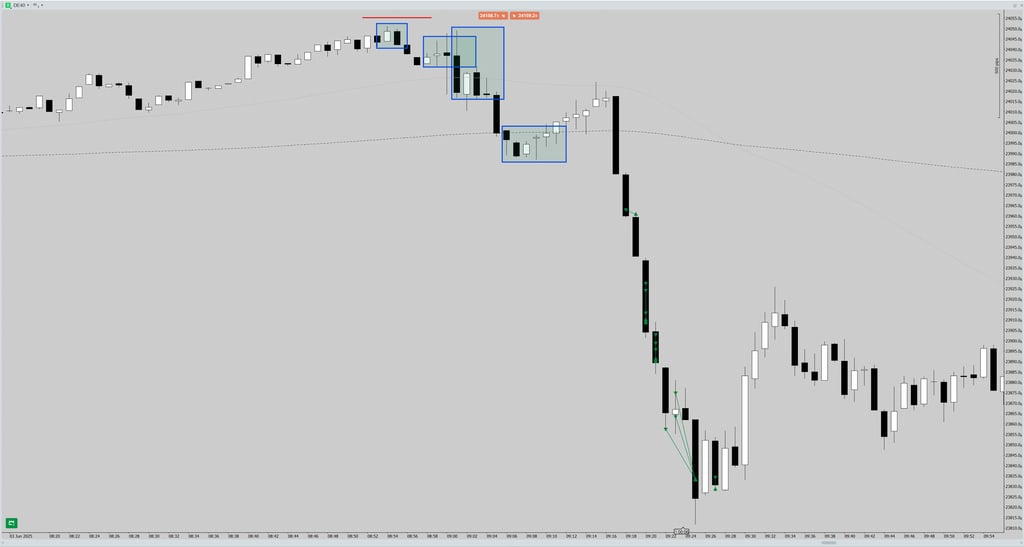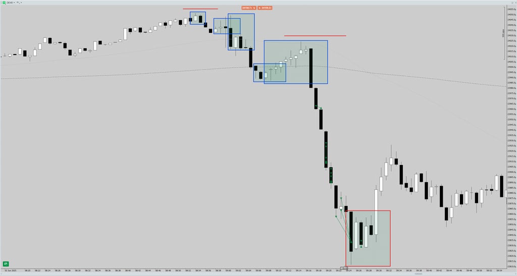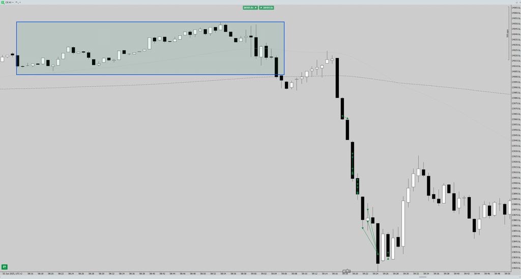 Moje wejścia w pozycje opierają się na dwóch założeniach Wybicie z zakresu, i wchodzenie po lepszej cenie w dany ruch, jeżeli taka okazja się pojawi. Dzisiaj ruch na de40 był tak silny i dynamiczny, że nie było za bardzo możliwości szukania jakiejkolwiek lepszej ceny. Po spadku na poziomie 150-200 punktów i tak nie otworzył bym zleceń po korekcie bo ten SL przekraczał by mój akceptowalny poziom strachu. Pomimo udanego dnia popełniłem dzisiaj kilka błędów. Pierwszy dotyczył zwlekania z otworzeniem pierwszej pozycji. Jeżeli chcę wchodzić w pozycję po tym jak cena zerwie poprzedni zakres ruchu to muszę to zrobić stosunkowo szybko. Ja tymczasem czekam kolejnych 25 punktów nim podejmę decyzje o skubaniu rynku. No i właśnie ten drugi element, jest kolejnym błędem. Skubanie rynku. Wystarczyło otworzyć 2-3 pozycje i po prostu je trzymać. Ja tymczasem zrobiłem chyba z 10 wejść zamykanych średnio co 10 punktów. Zdecydowanie lepszym pomysłem jest dodawanie kolejnych pozycji i nie zamykanie starych. Nic przez kolejnych kilka minut nie wskazywało na to, że cena zawróci. Ruch był silny dynamiczny i zdecydowany. To co jest ciekawe, to mój luz w tych pozycjach. Gdy zobaczyłem ile zarobiłem zrobiło się nerwowo. Do tego momentu otwierałem pozycje bez problemu. Wszystko rozegrało się tak szybko, że nie było czasu nawet na sprawdzanie tego czy jestem na plusie i ile tego jest. I to jest jakiś kierunek. Skupiłem się całkowicie na cenie na tym jak się porusza. I po prostu dołączyłem do tego tanga. Zgadza się, że na początku bardzo nieswojo podpierałem ścianę. Zupełnie niepotrzebnie. Był to efekt zakodowanych zasad. Otwieramy pozycje zgodnie z zasadami, czekam na potwierdzenie ustawiam SL-a i tak dalej. Tymczasem okazuje się, że zignorowałem całkowicie fakt, że mam dwa rozegrania, które rozgrywam. Ba analizując swoje dotychczasowe rozegrania, okazuje się, że wybicia zdecydowanie częściej rozgrywam. Zdecydowanie częściej też je griduje i trzymam na stracie. I może to dlatego zdecydowałem się trzymać tylko wejść po potwierdzeniu. Pamiętam natomiast dobrze walkę ze sobą, w momencie gdy otworzyłem pierwszą pozycję i zamykałem ją po kilku sekundach. Zrobiłem to bo uznałem, że jest otwarta niezgodnie z zasadami. Czego tu zabrakło? Mam wrażenie, że ponownie nie miałem scenariusza. Jak patrzę na ten wykres i analizuję te wejścia nie widzę nawet miejsca na potencjalnego sl-a. Zwłaszcza w momencie gdy zamykam zyskowne pozycje i otwieram kolejne niżej. To jest głupie. W momencie gdy cena zawróci zmiecie nie tylko zysk ale narazi mnie na stratę. Zupełnie inny komfort prowadzenia pozycji miałbym w sytuacji, gdy dodaję kolejne pozycje do tych zarabiających. Zamykam w ostatnim momencie i już. W scenariuszu zabrakło też odpowiedzi na pytanie co rozgrywamy. Zagranie wybijające, czy czekam na potwierdzenie.