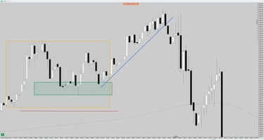 Ten niebiesko zielony prostokąt to jest wcześniej analizowany zakres. Cena nie dociera po wybiciu tego dolnego zakresu do strefy zniesienia mojej uznanej jako wejście w pozycję. Cała ta transakcja była by o kant koła. Co się więc zmienia w moim czytaniu ceny?