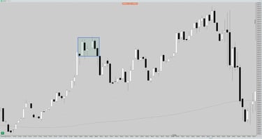 Pierwsze zanegowanie wzrostów. Kolejne 3 świece pokazują, że cena spada. Pojawia się jedna biała, która mieści się w zakresie ostatniej czarnej świecy. I teraz robi się trochę ciekawiej: