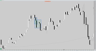 Kolejny zakres, cena spada niżej. Jest jakaś reakcja kupujących, ale nie są w stanie zamknąć się nad szczytem ostatniej czarnej świecy. Zamiast tego pojawia się kolejna czarna, negująca wzrosty. Cena zostaje zrzucona 3 świece niżej. I tu prawdopodobnie byłby pierwszy out z pozycji. Bo ostatnia czarna świeca: