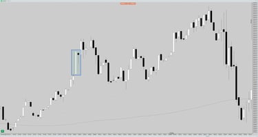 To poskładajmy ją po kolei wyraz po wyrazie. Literka po literce. Wracam do poprzedniego zakresu i skupię się na pierwszej dużej białej świecy. Losowo bo od czegoś trzeba zacząć. Widać jak cena przed tą świecą rośnie. Kolejne świece są coraz większe pojawia się ta długa biała świeca. Co jeszcze mi mówi ta świeca? Że nie ma żadnej presji z dołu ani z góry. Nie ma tutaj żadnego cienia. Mocna strefa buy. Kolejna czarna świeca jest wyciągnięta z dołu. Zamyka się wprawdzie w poprzedniej świecy. To co jest ważne, nie zamyka się pod nią. Czyli wzrosty dalej w grze. Kolejna rysuje się już tak: