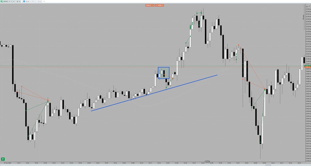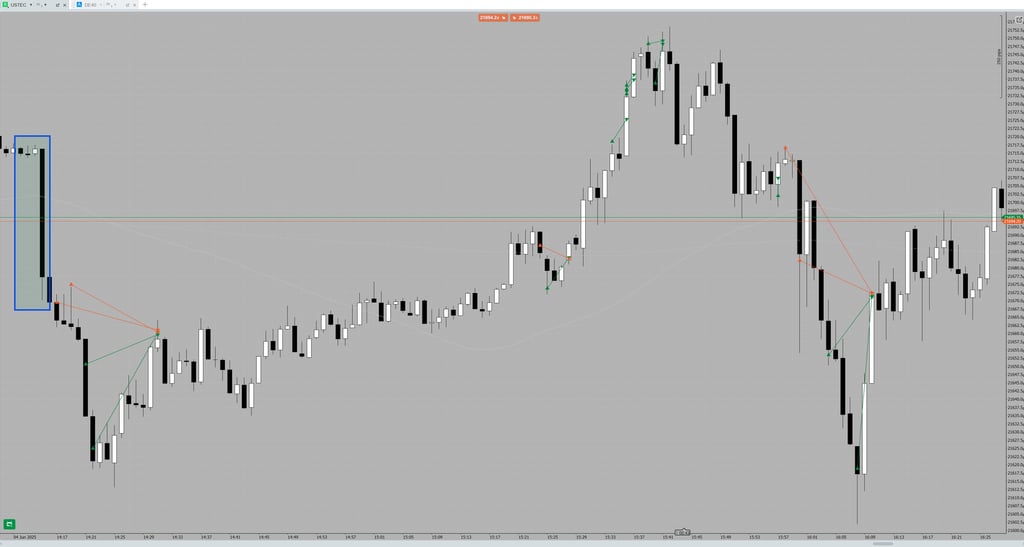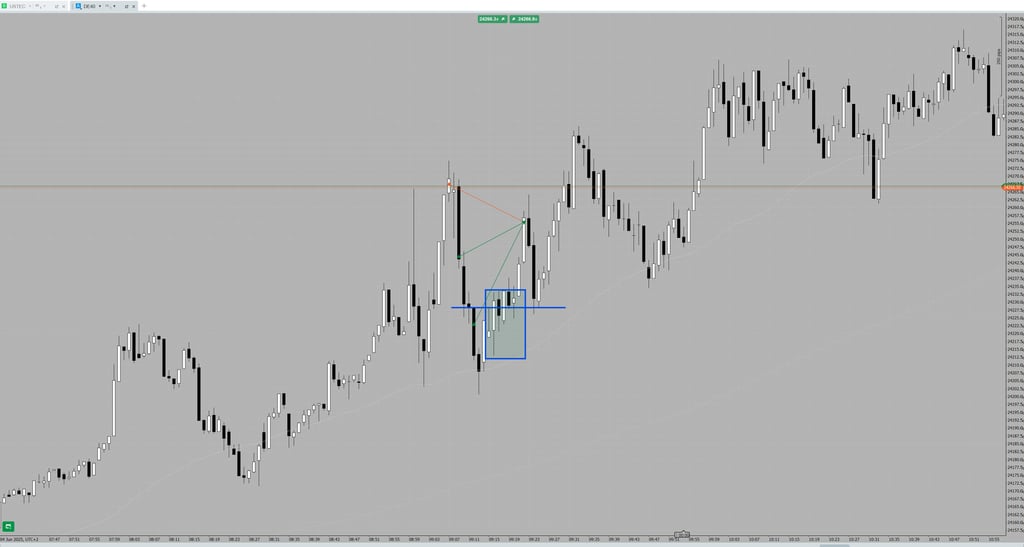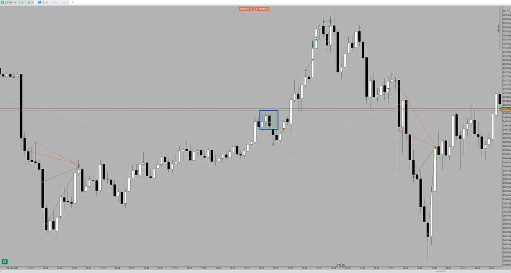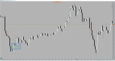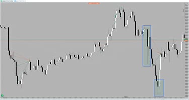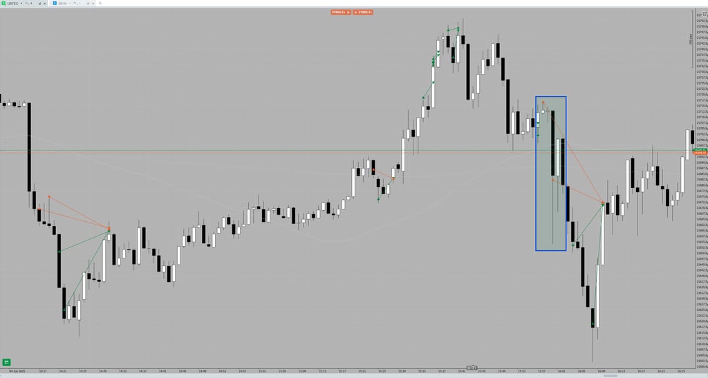 Zdecydowanie short. SL sprawdziłem jest poniżej 50 punktów więc w pełni akceptowalny. Czytając kolejne świece widać presję sprzedających do spychania ceny niżej. Do czasu aż trafiamy na sam dół: