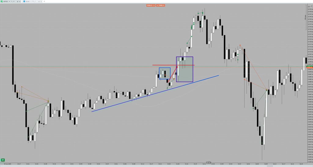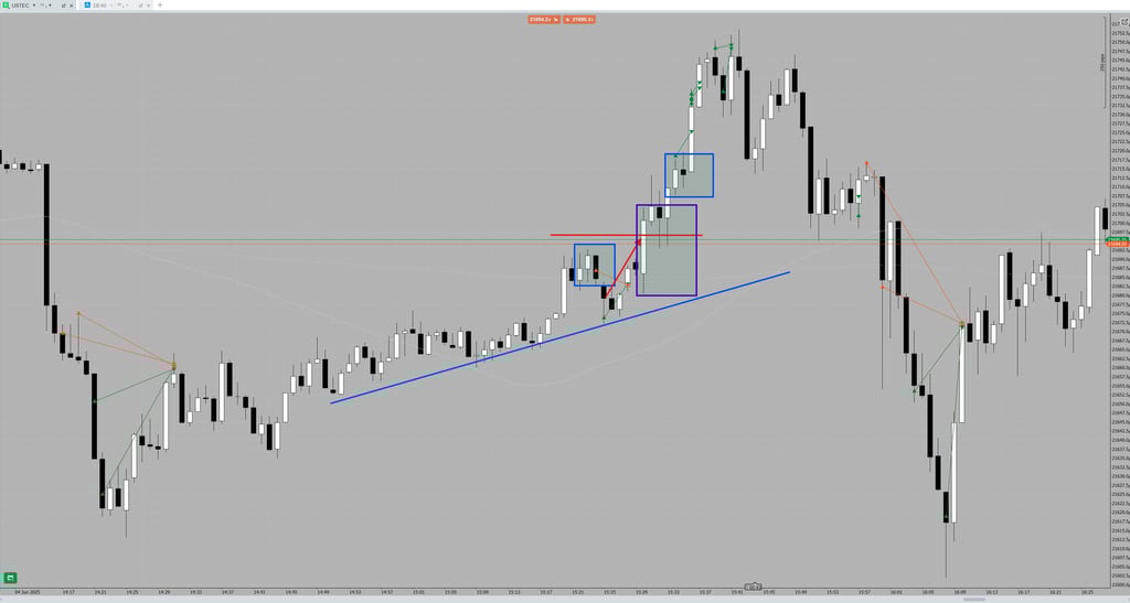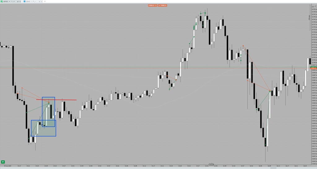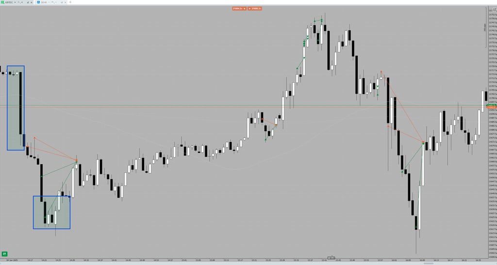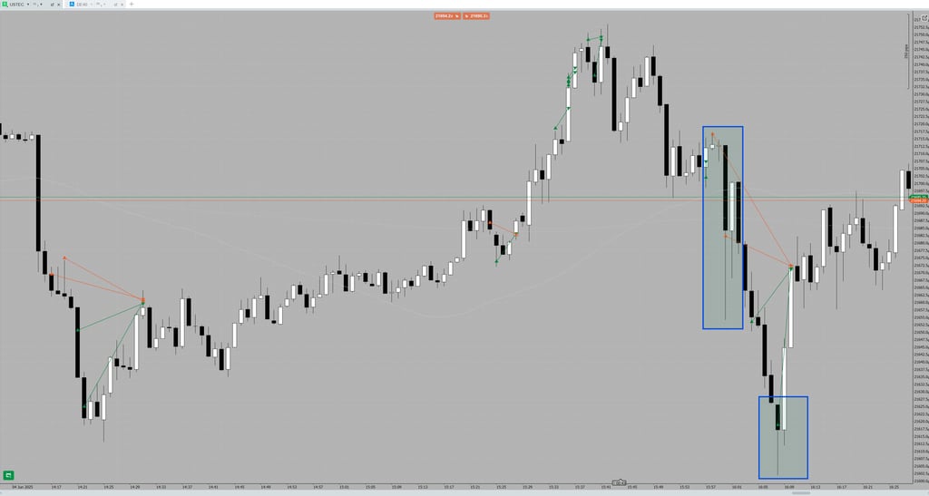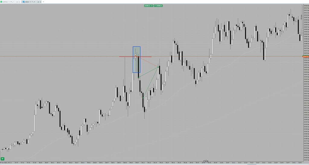 Zdecydowanie short. SL sprawdziłem jest poniżej 50 punktów więc w pełni akceptowalny. Czytając kolejne świece widać presję sprzedających do spychania ceny niżej. Do czasu aż trafiamy na sam dół: