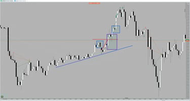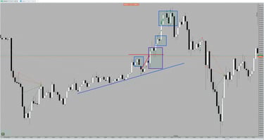 Cena wybija ostatni szczyt, ja go kupuję, Cena zaczyna zawracać, dodaję pozycję. I kolejną. Na szczęście cena nie przebija poprzedniego dna i zaczyna zawracać. Skasowałem zysk na poziomie 30-40 punktów. Cały proces, który stoi za tą pozycją rozrysowałem poniżej: