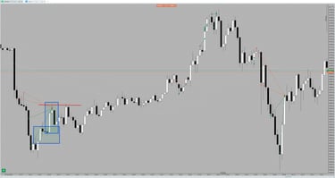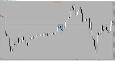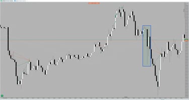 Tutaj widać, że cena zeszła poniżej tego zakresu i wybijając do góry zanegowała poprzednią czarną świecę. To powinien być pierwszy znak ostrzegawczy do ucieczki z pozycji. KOlejna biała świeca jest już nad tym obszarem. Więc tutaj już musi zadziałać mechanizm odwróconej pozycji. Powinienem zagrywać LONG. Pozycja short przy pierwszym sygnale ostrzegawczym daje 50 punktów zysku, przy tej długiej białej wybijającej jest to +35 punktów.