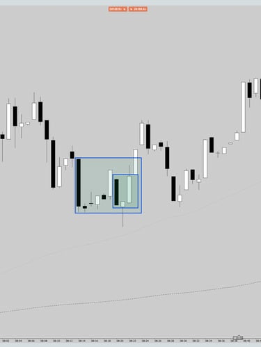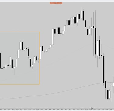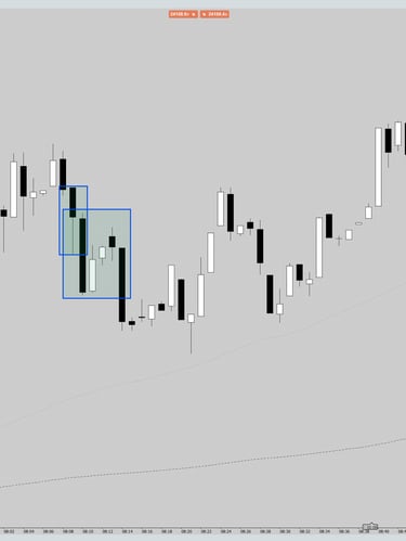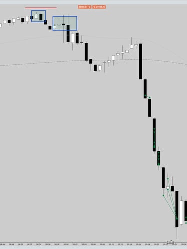 Jest kolejne bum. Kolejena czarna świeca i nawet ta następna już powinny dać do myślenia. Wygląda to trochę jak oddanie pola kupującym. Jak by sprzedający mówili, dobra zrzuciliśmy cenę tutaj dalej nie chce nam się jej pchać. Bo te świece powinny być mocne i spadkowe... Są ledwo widoczne. Za to kupujący zbierają się do ataku. Widać jak kolejne świece nie tylko zmieniają kolor na biały, ale i rośnie momentum. Są dłuższe pozbawione knotów z góry. Pojawia się jedna czarna. Dalej w zakresie tej długiej spadkowej świecy. Udaje się nawet sprzedającym zejść niżej. Został po tym ruchu sam knot i zaczęło się pchanie ceny w drugą stronę. I ten moment, zanegowania tej czarnej świecy w kwadracie jest też sygnałem do reakcji.