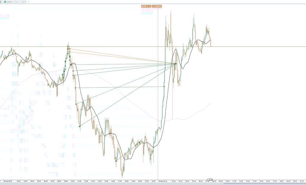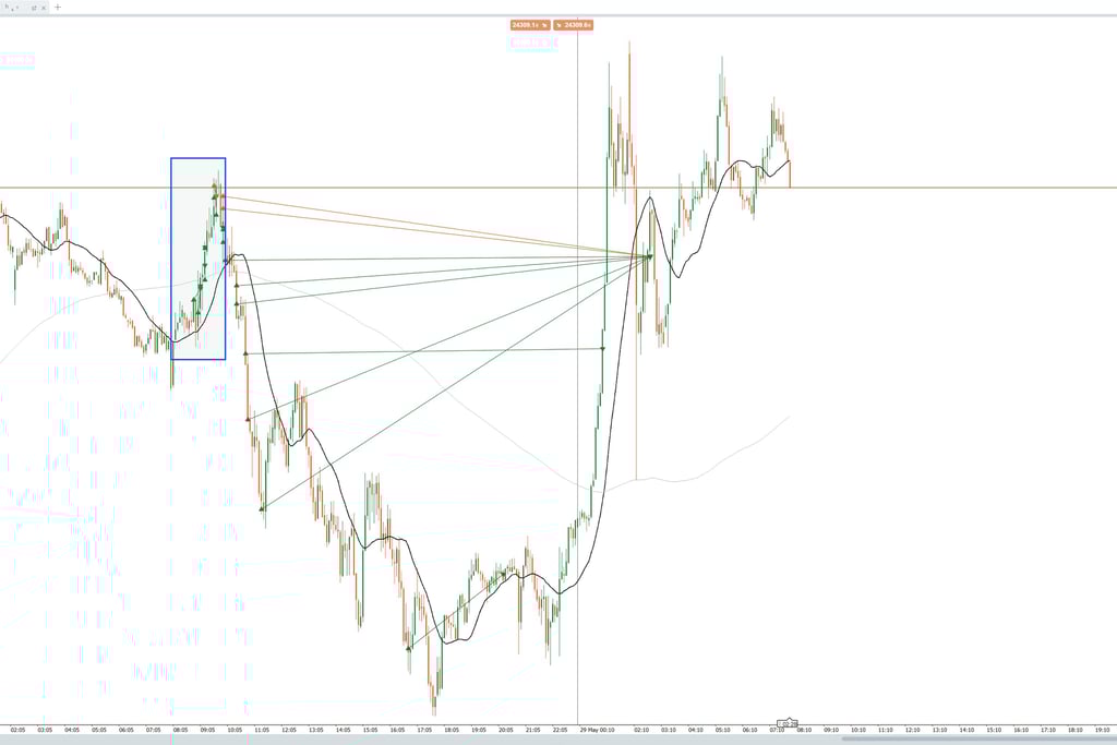Na powyższym obrazie widać już to co wydarzyło się na samym końcu. Nie będę teraz skupiał się na swojej strategii, czy na tym jakie były podstawy do tego, żeby zająć pozycję. Chcę tutaj pokazać to co niszczy trading każdego kto chce zająć się poważnie tym zagadnieniem. Zielone strzałki na wykresie pokazują miejsca transakcji. Pewnie jeszcze dopracuje graficznie te wykresy, żeby wyglądały trochę lepiej. Platforma też nie jest do tego idealna. To tylko tło. Ten jeden obraz mówi wszystko o mojej spekulacji.